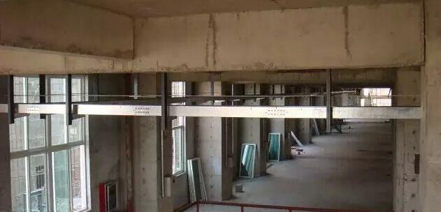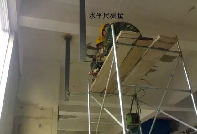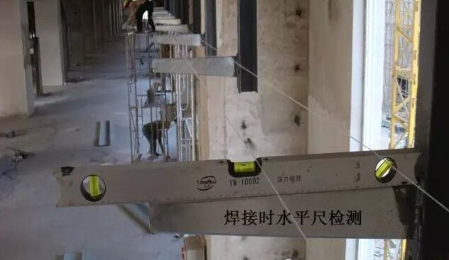4、根據(jù)土建所給標(biāo)高,確定兩端立柱焊接位置,立柱焊接在墊板上,焊接前使用水平尺進(jìn)行檢測(cè)以保證立柱垂直度。
