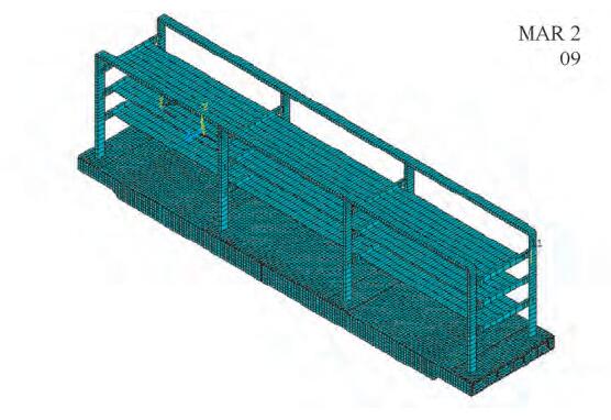 采用ANSYS 建立有限元模型,建模過程中進行了適當(dāng)?shù)暮喕幚恚娎|橋架模型中托板及底座采用SHELL63 單元,立柱與橫檔采用BEAM4 單元,螺栓采用BEAM188 單元。電纜橋架有限元模型見圖2。