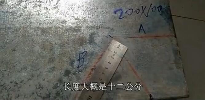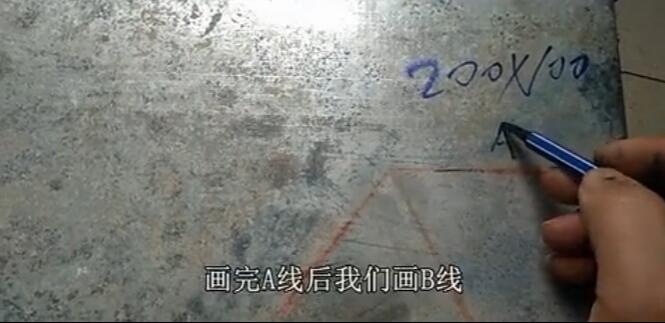 我們來先看第一種做法,我們要做的大小頭是200X100大小頭,我們來畫第一條線來確定橋架大小頭的大小,用A來代表這條線,畫完A線后我們畫B線,A線是用來區分變徑大小的,B線可隨意畫,畫完后測量B線長度,長度大概是12公分,確定B線長度來畫C線點,