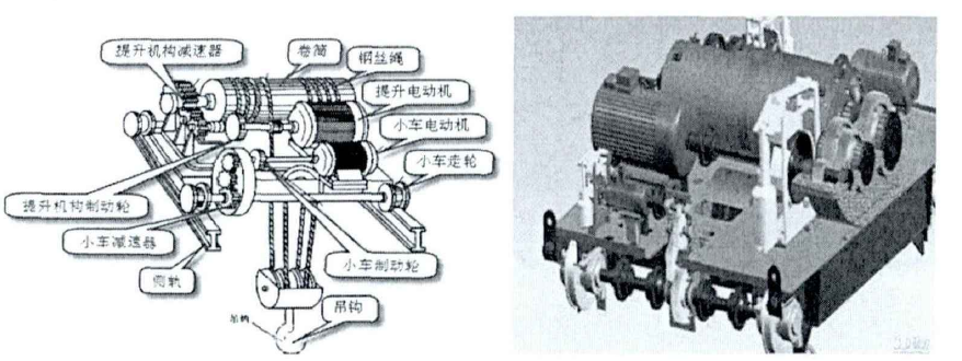 起重小車安裝于橋架上,由起升機(jī)構(gòu)、小車運(yùn)行機(jī)構(gòu)、起重小車架組成。起升機(jī)構(gòu)用于實(shí)現(xiàn)貨物的升降:小車運(yùn)行機(jī)構(gòu)用于驅(qū)動起重小車沿橋架上的軌跡水平橫l句運(yùn)行;小車架用于支撐整個小車,承受載荷,如圖2-3所示。