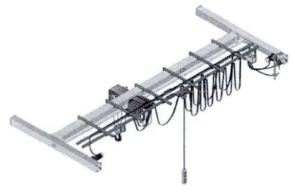 單梁橋式起重機(jī)主要由橋架、大車運(yùn)行機(jī)構(gòu)、電動葫蘆和電氣設(shè)備組成,其通過電動葫蘆來升降重物和沿著主梁運(yùn)行,相當(dāng)于橋式起重機(jī)的起重小車,該類起重機(jī)具有起重量大、工作速度高、生產(chǎn)率高的特點(diǎn),如圖2-1所示。