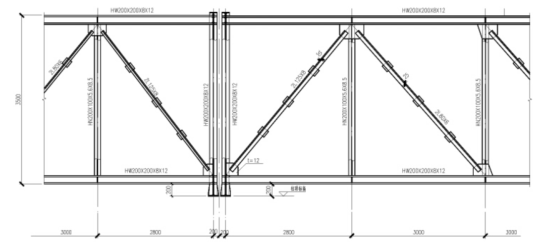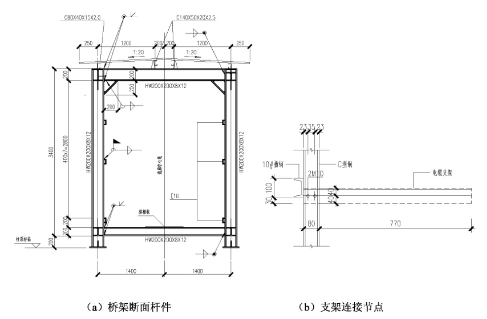 30m 和40m 跨橋架均采用普通鋼結構形式。圖3 為30m 跨橋架斷面結構桿件布置圖, 其上下弦桿件外圍高度為3.4m,考慮到排水及美觀因素,在其頂面用C 型鋼和彩鋼板設置了坡屋頂。在斷面內部的小立柱上布置了3 根通長的10# 槽鋼,用于連接豎向C 型鋼,在C 型鋼上最終連接電纜支架(共7 回),具體如圖3(b)所示。橋架縱向立面如圖4 所示。桁架直接按簡支落在河道兩側的鋼柱上,因此考慮支座處的空間關系,30m 跨2 個端部各留200mm 的距離, 因此30m 桁架在端部的節(jié)間長度為2.8m,其余節(jié)間長度均為3m,40m 跨和50m 跨度的橋架節(jié)間長度同理設置。桁架上弦和下弦每跨均設置了交叉支撐,以保證結構剛度。