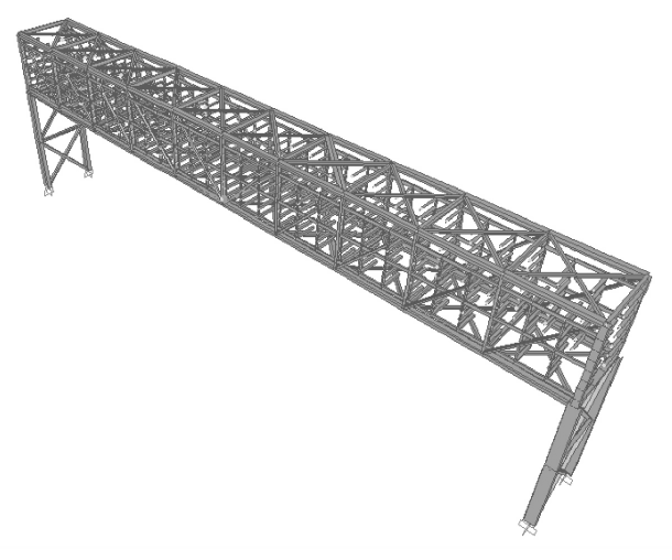 分析軟件采用SAP2000 有限元分析軟件。過河橋架通廊采用簡支方式落在柱子上,柱子與基礎采用剛接柱腳。雖然過河橋架兩端分別有其他跨連接, 但其他跨的存在主要對柱子內力產生影響,對橋架本身影響可以忽略,因此分析僅取過河段進行研究。SAP2000 中地震荷載模式下,其結構阻尼比默認為0.05,對于鋼結構,調整為0.035。桁架落在兩側鋼柱頂?shù)奈恢茫瑢⑵涔?jié)點的彎矩約束釋放,從而為鉸接。橋架分析整體模型如圖5 所示。